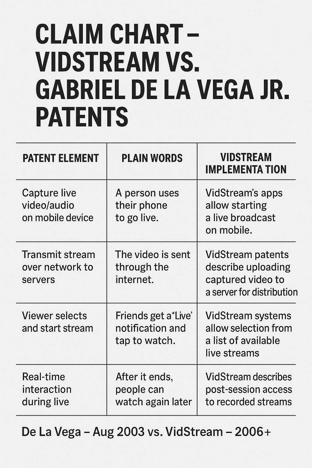 | Patent Element (De La Vega) | Plain Words | VidStream Implementation & Links |